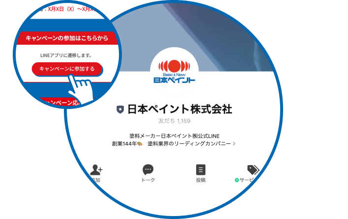 本サイト内の「キャンペーンに参加」ボタンまたは、LINEアプリ内の公式ラインより「日本ペイント株式会社」のアカウントを検索し、友だち追加をしてください。